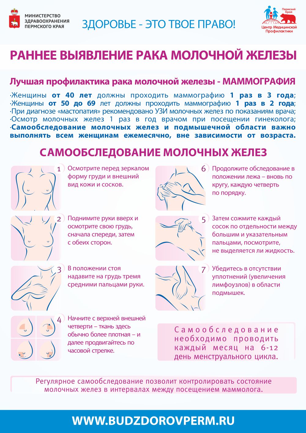 Каждая женщина может самостоятельно обнаружить признаки заболевания, регулярно проводя обследование молочных желез не реже одного раза в месяц. Посмотрите на карточку и проведите самообследование сегодня! Также важно посещать маммолога, гинеколога и терапевта для профилактических осмотров.